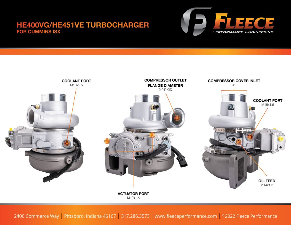 From the turbo experts at Fleece Performance comes our all-new HE400VG / HE451VE replacement turbocharger - providing you with a new, reliable replacement turbocharger to get you back on the road. Fleece Performance Engineering turbochargers set the industry standard for quality and reliability - our turbocharger is a direct replacement for Cummins ISX CM2250 and CM2350 models.