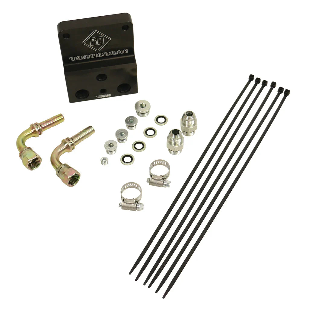 When producing more power from a Dodge RAM 2500/3500 with a Cummins engine, more fuel is required. To supply the injection pump with additional fuel, upgraded lift pumps are added, often with additional filters and water separators to ensure the fuel is always clean. With these upgrades, the factory fuel filter assembly becomes a redundant restriction, or is bypassed completely. The BD Diesel Fuel Bowl Delete kit is designed to remove the factory fuel filter assembly, and allow the addition of a fuel pressure sensor. The kit can also be used as a distribution block for applications using dual CP3 kits. Please note that this kit is intended to be an accessory in addition to an auxiliary lift pump and filter assembly. If the factory CP3 pump feed line has not been upgraded to 1/2-inch hose, an upgraded feed line assembly will be required. See optional accessories for details. WARNING: The use of this kit without auxiliary filters and water separators installed is strongly discouraged. Without a fuel filter in place, the injection system on the diesel engine could become damaged.