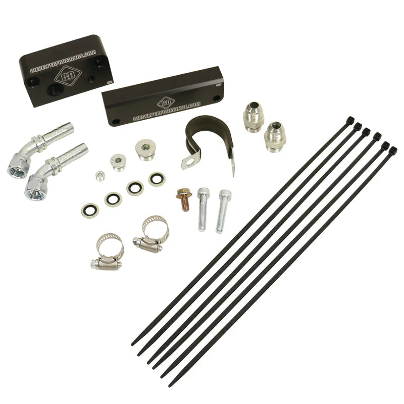 When producing more power from a Dodge RAM 2500/3500 with a Cummins engine, more fuel is required. To supply the injection pump with additional fuel, upgraded lift pumps are added, often with additional filters and water separators to ensure the fuel is always clean. With these upgrades, the factory fuel filter assembly becomes a redundant restriction, or is bypassed completely. The BD Diesel Fuel Bowl Delete kit is designed to remove the factory fuel filter assembly, and allow the addition of a fuel pressure sensor. The kit can also be used as a distribution block for applications using dual CP3 kits. Please note that this kit is intended to be an accessory in addition to an auxiliary lift pump and filter assembly. If the factory CP3 pump feed line has not been upgraded to 1/2-inch hose, an upgraded feed line assembly will be required. See optional accessories for details. WARNING: The use of this kit without auxiliary filters and water separators installed is strongly discouraged. Without a fuel filter in place, the injection system on the diesel engine could become damaged.